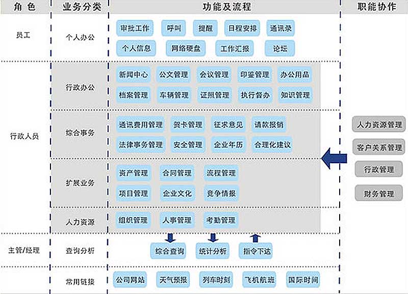 包括公共信息、新(xīn)闻中心、公文(wén)管理(lǐ)、规章制度、会议管理(lǐ)、車(chē)辆管理(lǐ)、行政管理(lǐ)和费用(yòng)申报管理(lǐ)。同时可(kě)拓展到人力资源管理(lǐ)内容,如人员考勤、员工生日提醒、合同到期提醒、试用(yòng)期到期提醒、退休提醒等。